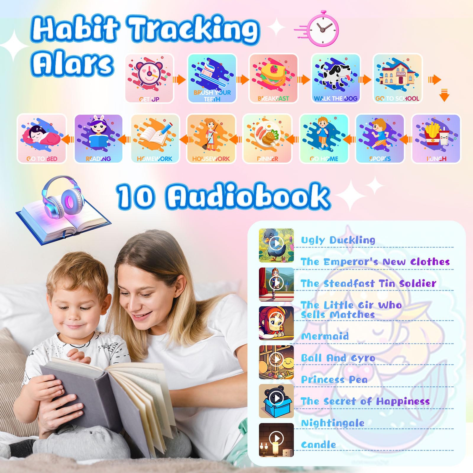 Study Cards and Storybook Audiobook: Built-in learning cards, learning different animals, vegetables and colors, the best choice for children's enlightenment education. 10 different audio stories to accompany your child's growth and practice speaking and listening. Combine fun with learning.